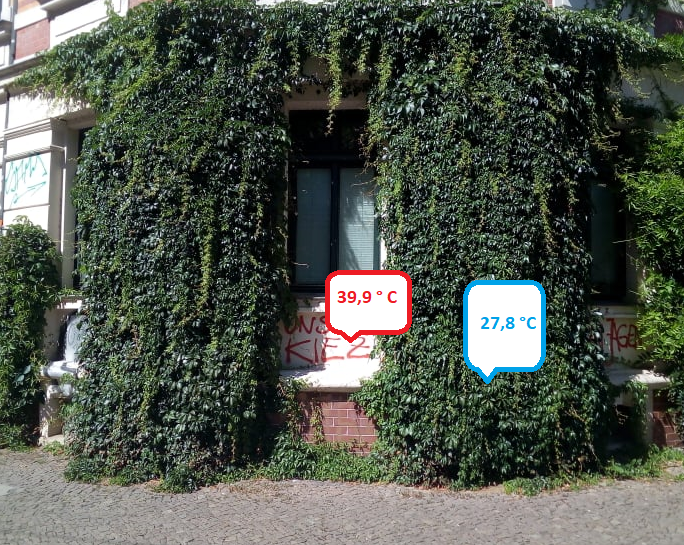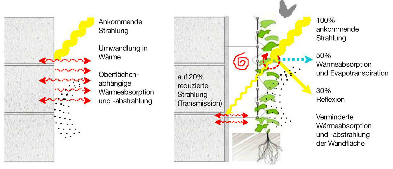 Begrünte Fassaden sind "urbane Klimaanlagen", denn wie eine Klimaanlage kühlen die Pflanzen mit ihrem Blattwerk ihre Umgebung und das Gebäude selbst. Sie können aktiv zur Bekämpfung von Hitzeinseln eingesetzt werden. Das besondere Plus: Kletterpflanzen können platzsparend an bestehenden Oberflächen wachsen und so flexibel auch in besonders betroffenen Stadtgebieten und Straßenzügen für wohltuende Abkühlung sorgen.