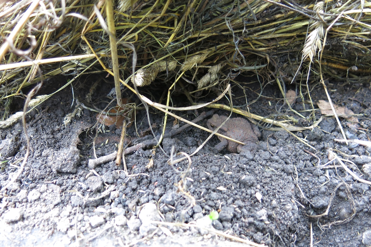 Rasenschnitt, Beikräuter (z.B. Brennnessel, Borretsch, immer vor dem Aussamen!), Grünschnitt, aber auch die ausgegeizten Triebe der Tomatenpflanzen eignen sich hervorragend und können ganz im Sinne der natürlichen Kreislaufwirtschaft dem Boden gleich wieder zugeführt werden. Die Schicht sollte wenigstes 5 cm hoch sein. Voraussetzung ist selbstverständlich immer, dass diese Pflanzenreste gesund sind! Mit Mehltau oder Braunfäule befallene Pflanzenteile gehören weder aufs Beet noch auf den Kompost. Sie müssen über die braune Biotonne entsorgt werden. Das Mulchmaterial bietet Unterschlupf für kleinere Nützlinge (Tausenfüßer, Asseln, Regenwurm) und im besten Fall fühlen sich dort auch größere Helfer wie die Erdkröte wohl. Dann hat man gleich einen natürlichen Partner bei der Nacktschneckenjagd.