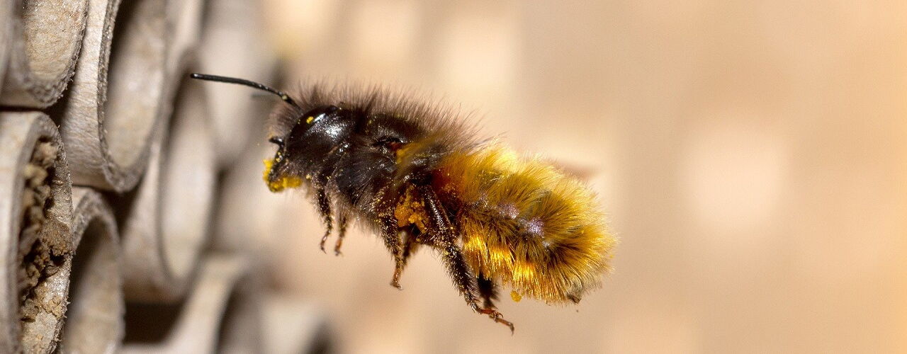 Es besteht also keinerlei Gefahr, wenn Wildbienen in menschlicher Nähe auf Nistplatzsuche gehen. Bei den pelzigen Besuchern, die alles besiedeln, was eine kleine runde Öffnung hat, handelt es sich sehr häufig um Gehörnte Mauerbienen. Sie gehören zu den 585 deutschlandweit dokumentierten Wildbienenarten und beweisen immer wieder große Kreativität bei der Nistplatzsuche.