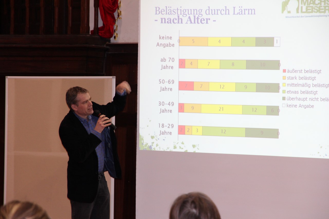 Zahlreiche Anwohnerinnen und Anwohner aus dem Leipziger Norden folgten der Einladung und besuchten die „Mach's leiser“ Veranstaltung am 2. März 2011. In der Aula der Gohliser Schiller-Schule stellte Projektleiter Tino Supplies vom Ökolöwen die Idee und den geplanten Ablauf des Projekts vor. Ralf Elsässer vom Planungsbüro CivixX gab einen Einblick in die Zwischenauswertung der schriftlichen Anwohnerbefragung zum Thema Umgebungslärm. Die städtische Lärmkartierung erläuterte Johannes Dohmen vom Amt für Umweltschutz der Stadt Leipzig. Anhand von Praxisbeispielen veranschaulichte Fritjof Mothes vom StadtLabor, wie in anderen Städten Lärmschutz erfolgreich umgesetzt wird.