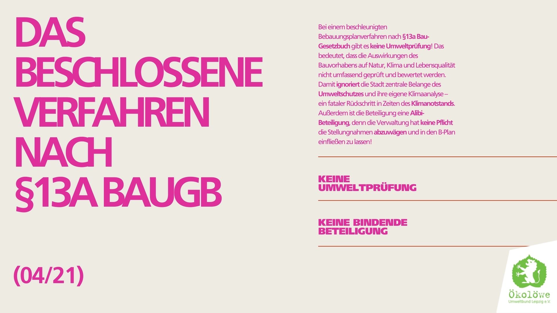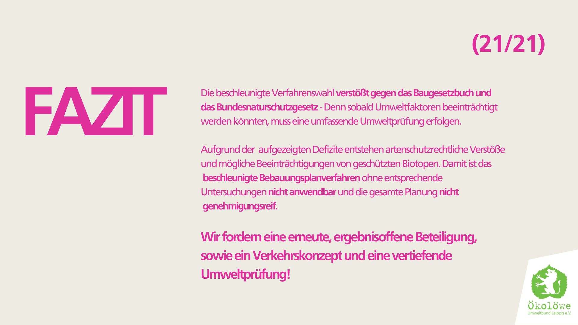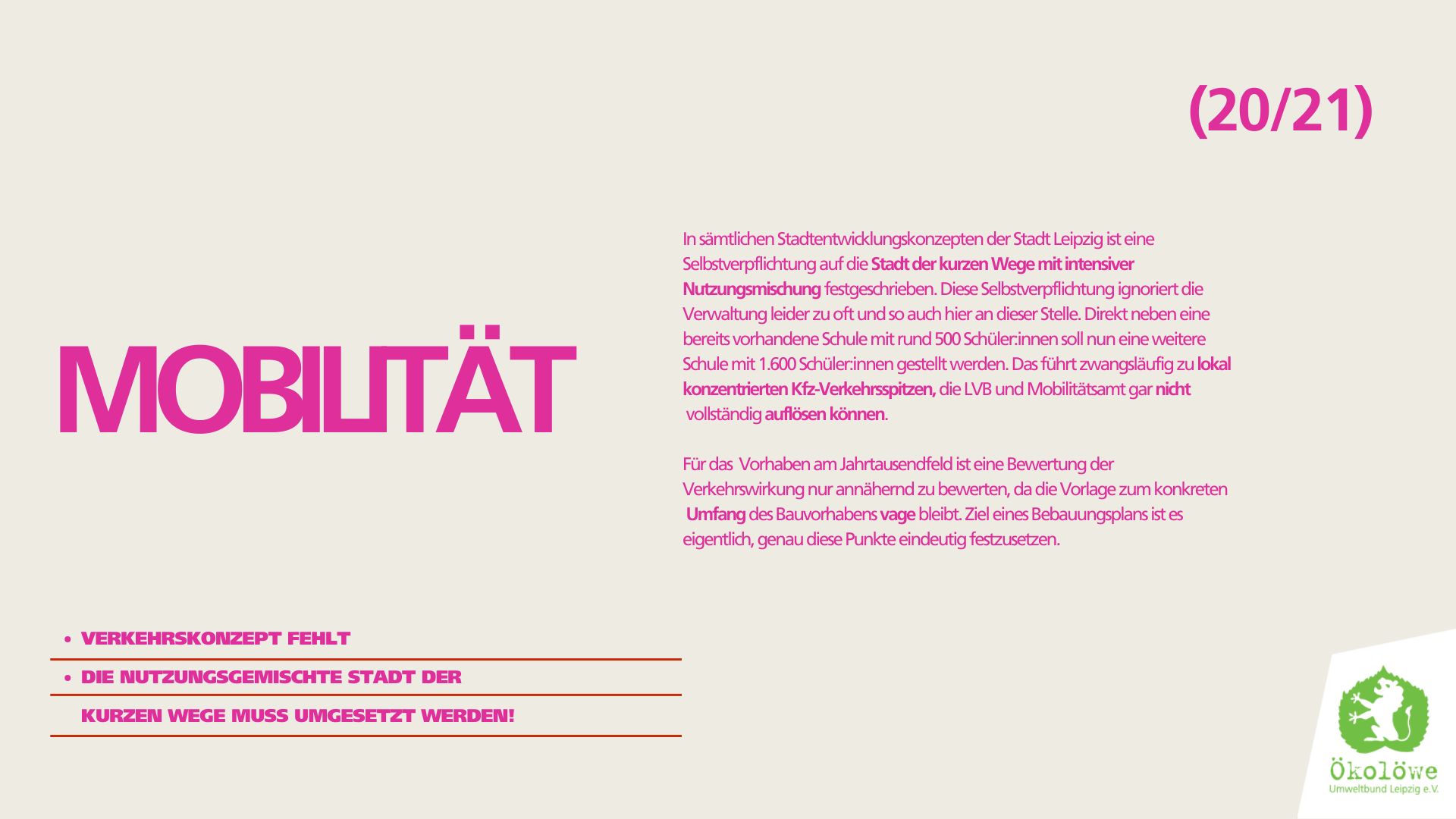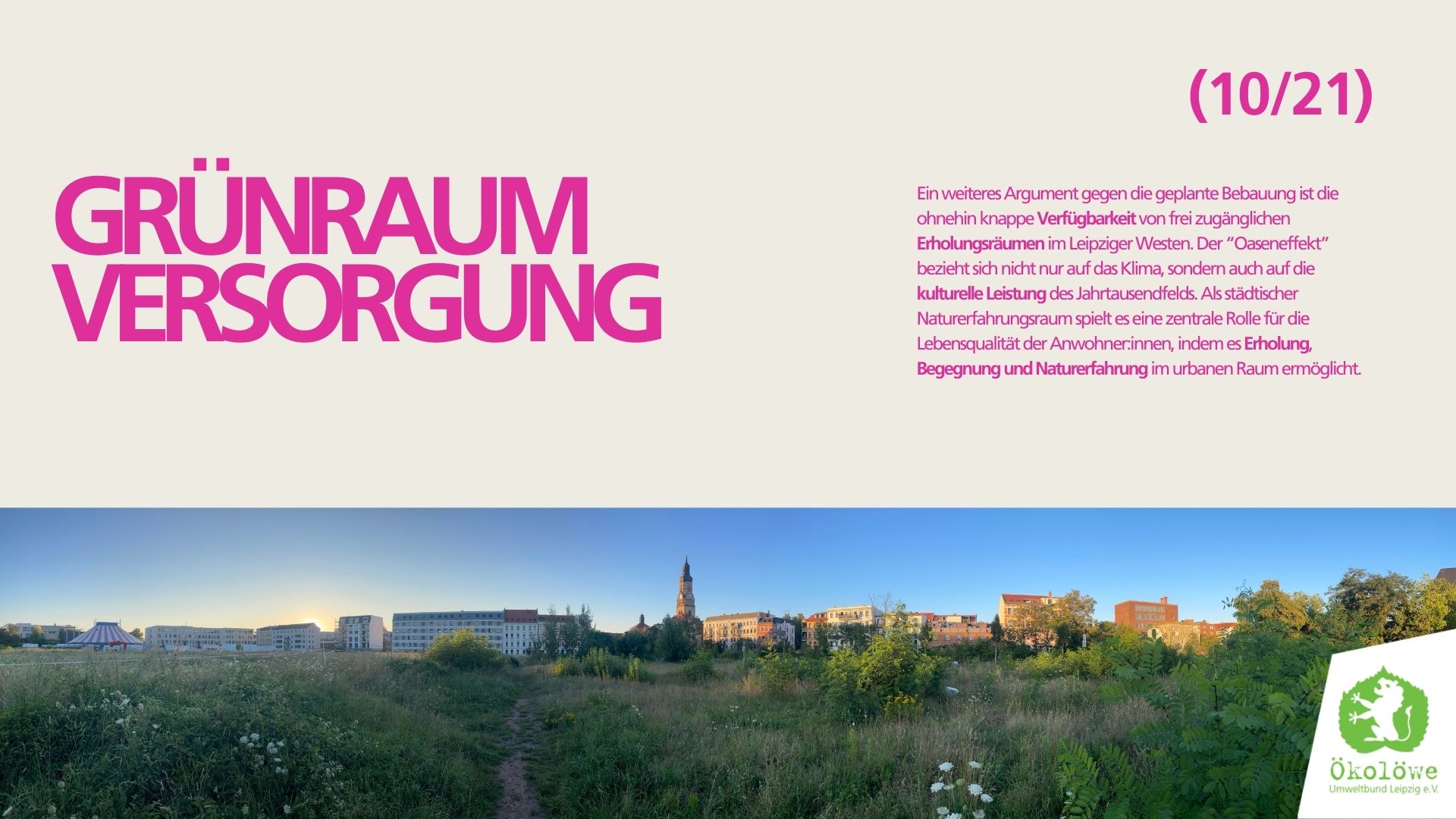 Wir Ökolöwen fordern, dass die Stadt das beschlossene B-Plan-Verfahren auch wirklich umsetzt und die Öffentlichkeit nach §3 BauGB beteiligt. Wir fordern für das Jahrtausendfeld weiterhin einen Stadtteilpark, der seinen Namen verdient – Eine kleine “Alibi-Grünfläche” reicht nicht und die geplante Baumasse ist nach wie vor überdimensioniert! Das Viertel braucht einen echten Park, der seiner Funktion als grüne Oase und Begegnungsort gerecht wird, die Klimaanpassung ermöglicht und die Lebensqualität spürbar steigert. Der Stadtteilpark muss ohne Einschränkungen öffentlich zugänglich sein.