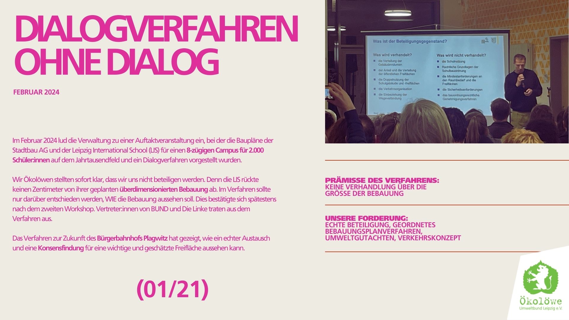Wir Ökolöwen stellten bei der Veranstaltung sofort klar, dass wir uns an dem Dialogverfahren nicht beteiligen werden. Es war für uns absehbar, dass hier kein echter Dialog zustande kommen würde. Denn die LIS rückte keinen Zentimeter von ihrer geplanten überdimensionierten Baumasse ab. Im Verfahren sollte lediglich darüber entschieden werden, WIE die Bebauung aussehen soll.