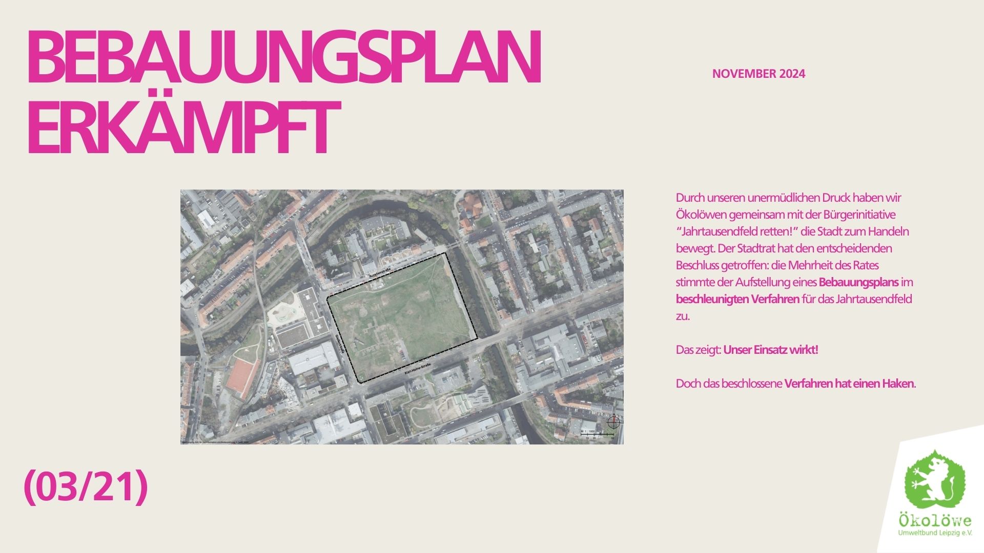 Stadtrat beschließt Verwaltungsstandpunkt zur Petition "Ein Stadtteilpark für alle!" von Bürgerinitiative (BI) "Jahrtausendfeld retten!" - es wurde lediglich festgelegt, dass der OBM öffentliche Freiräume absichert - kein B-Plan, keine Angaben zur Größe der Fläche