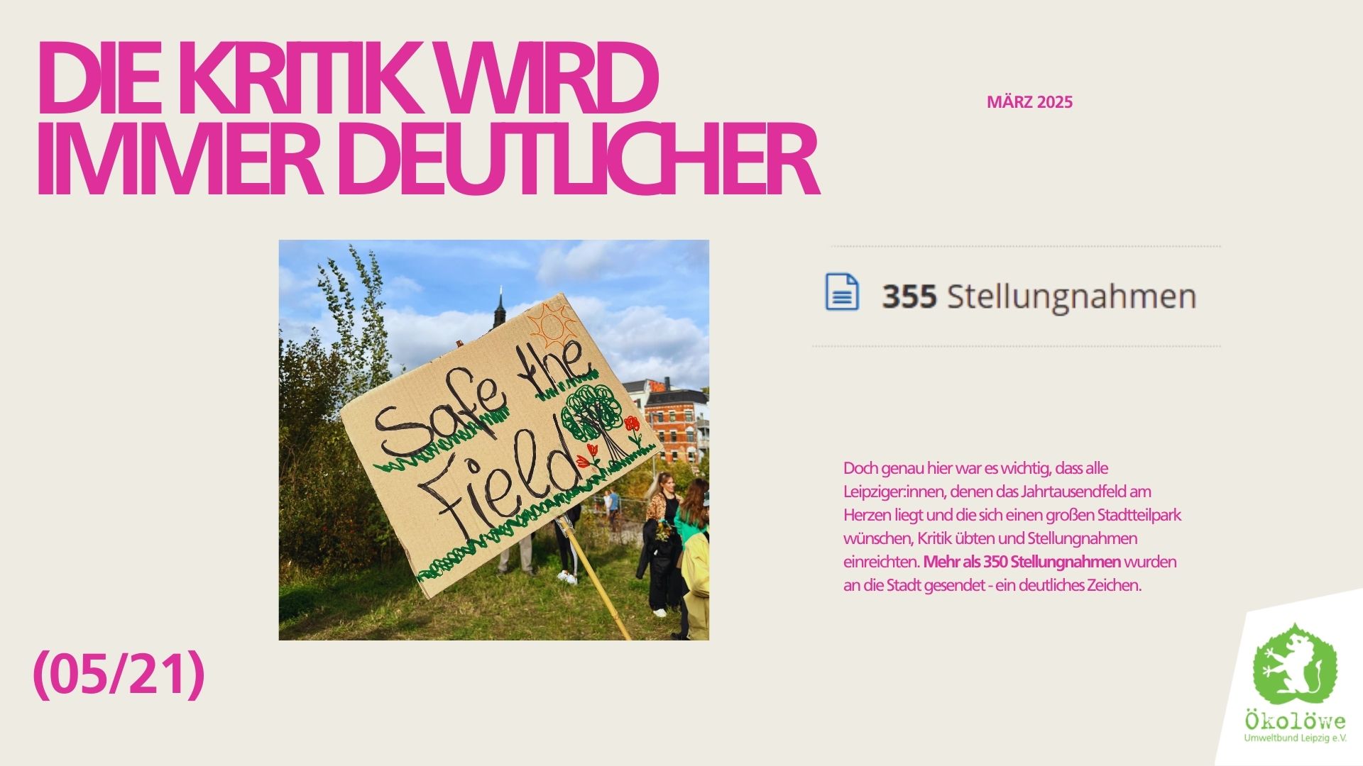 Nun am 17.09.2025 war in der Zeitung zu lesen: Schulcampus-Pläne gescheitert: Jahrtausendfeld in Leipzig wird vorerst nicht bebaut. Die umstrittenen Pläne für eine überdimensionierte Privatschule auf dem Jahrtausendfeld sind demnach laut Investor ad acta gelegt! Wir Ökolöwen freuen uns über diesen Zwischenerfolg, sollte sich die LVZ-Schlagzeile tatsächlich bewahrheiten. Tausende Leipziger:innen protestierten gemeinsam mit uns Ökolöwen und der Bürgerinitiative “Jahrtausendfeld retten!”. Wir zeigten, wie wichtig das Jahrtausendfeld für Plagwitz und Lindenau ist.
