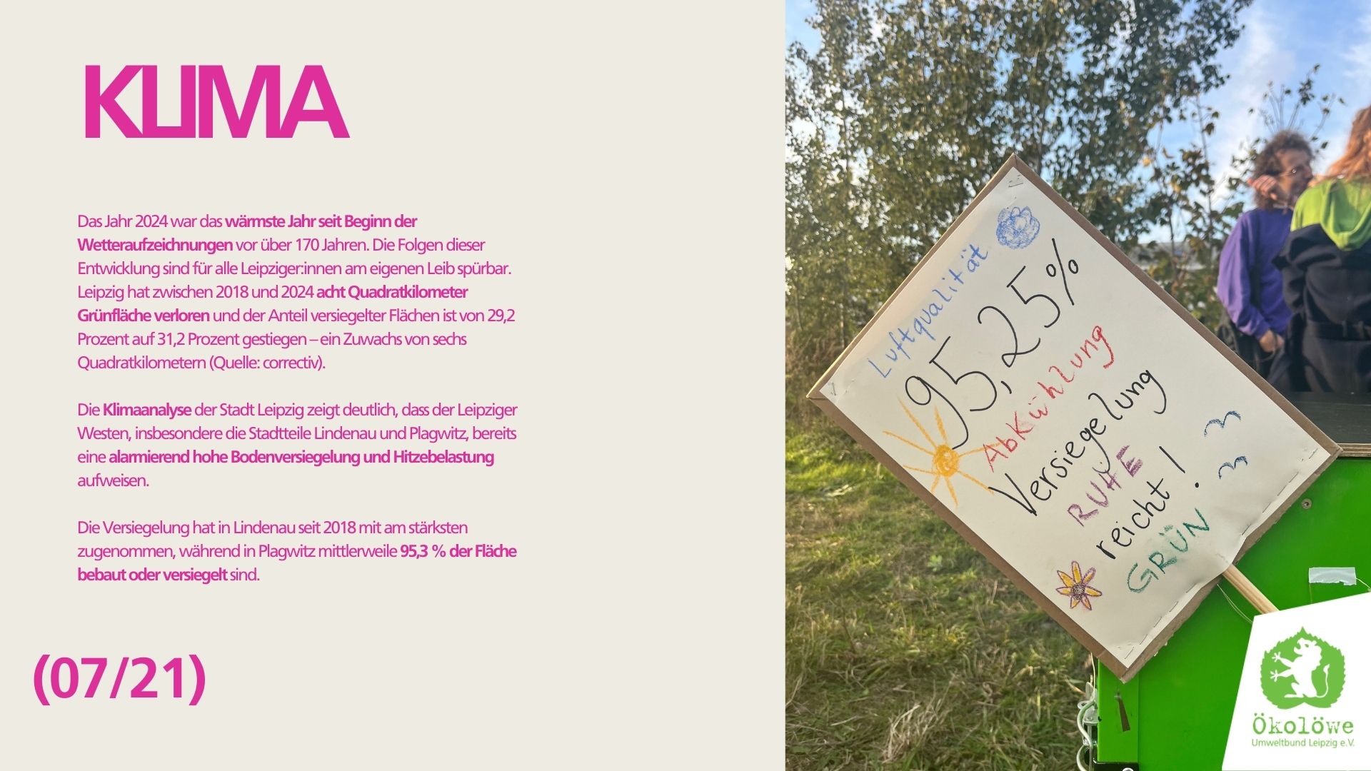 Das Jahrtausendfeld ist nicht das erste Gebiet im Leipziger Westen, das einem Bauvorhaben weichen soll. Lindenau ist eines der zehn Viertel in Leipzig mit der stärksten Bodenversiegelung seit 2018 und Plagwitz weist bereits einen Versiegelungsgrad von 95,3% auf! Diese Entwicklung bedeutet einen erheblichen Verlust, denn nur eine grüne Stadt bietet Lebensqualität – nicht nur für die Menschen. Leipzigs Grünschwund muss gestoppt werden!