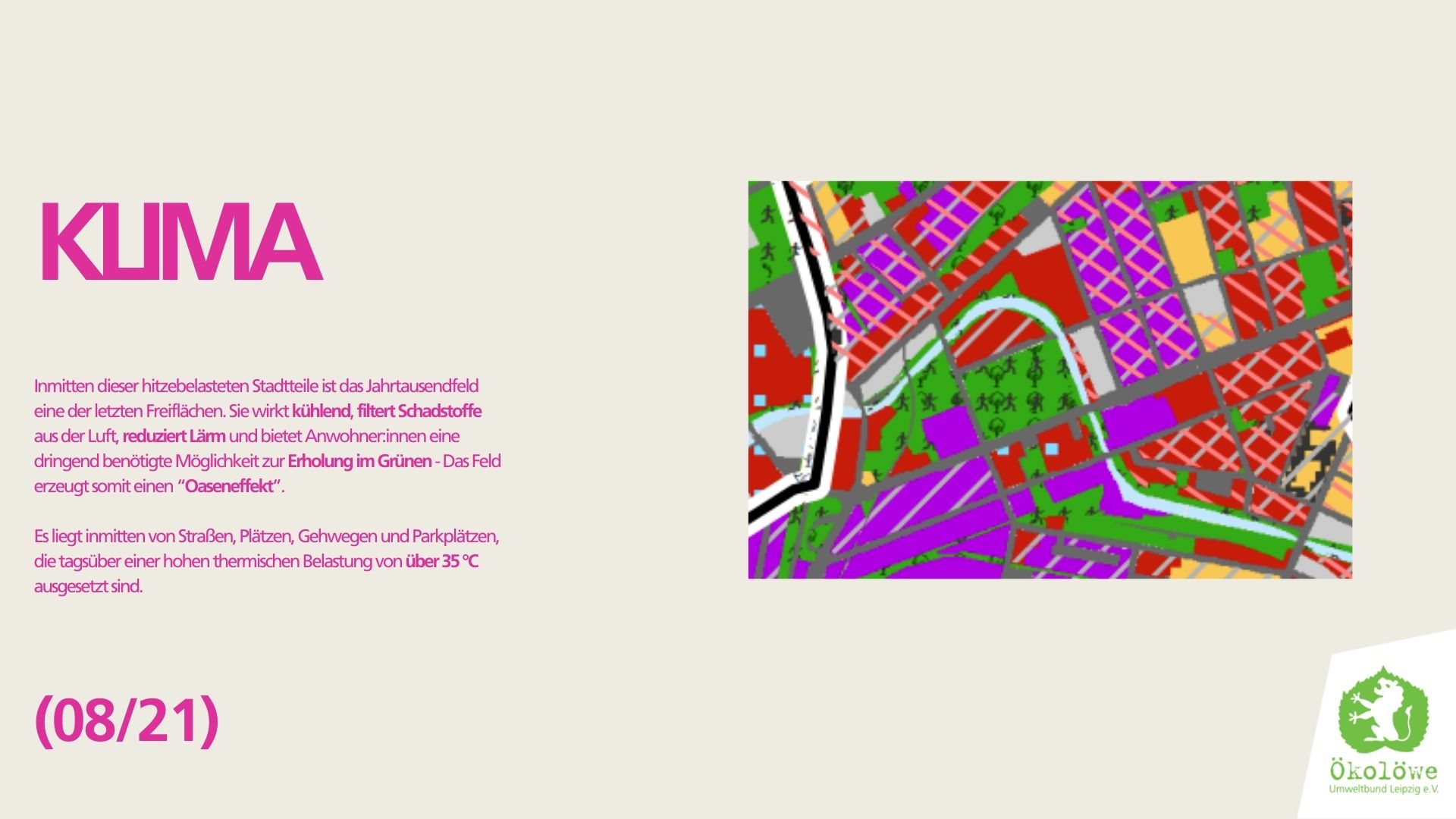 Beim Jahrtausendfeld handelt es sich genau wie beim Bürgerbahnhof Plagwitz um eine 2,3 ha große öffentliche Freifläche, welche schon jetzt lokal zur Verbesserung der Luftqualität, zur Reduzierung der Sommerhitze und zur Lärmminderung beiträgt. In der Klimaanalyse der Stadt Leipzig wird das Jahrtausendfeld deswegen als Grünfläche mit sehr hoher Schutzwürdigkeit ausgewiesen. In der Analyse heißt es: “Dem Schutz und Erhalt dieser Grünflächen sollte eine sehr hohe Priorität beigemessen werden und grundsätzlich eine Bebauung ausgeschlossen werden.”