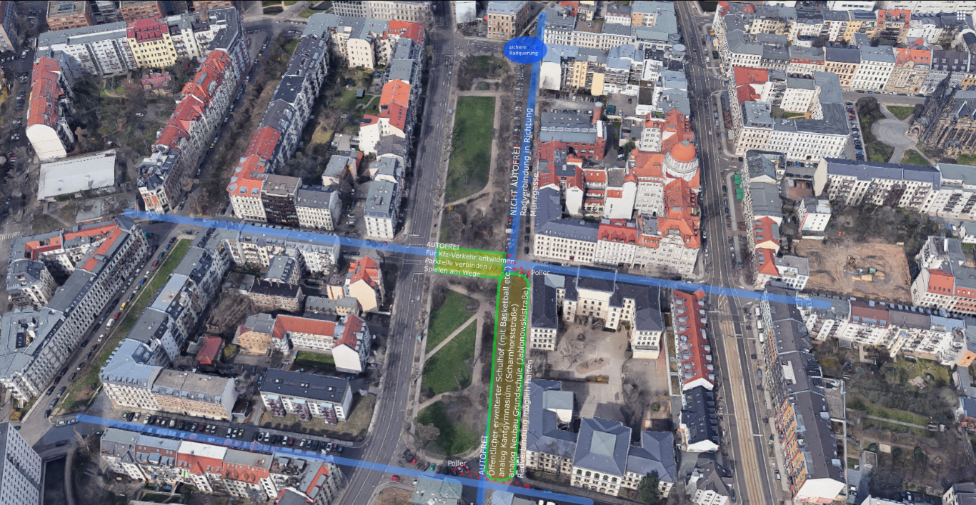 Für die von uns Ökolöwen vorgeschlagene Lösung gibt es in Leipzig schon einige gute Beispiele. Eines davon ist der erweiterte Schulhof des Kantgymnasiums in der Südvorstadt. Hier wurde die Scharnhorststraße zwischen Karl-Liebknecht- und Kochstraße für den Kfz-Verkehr entwidmet. Die Schüler des Kantgymnasiums haben einen attraktiven und sicheren Bereich vor der Schule bekommen. Für die Menschen im Viertel bietet sich ein Ort für Kommunikation, Sport und Spiel. Genau solch eine Gestaltung braucht es nun auch vor der Petrischule.