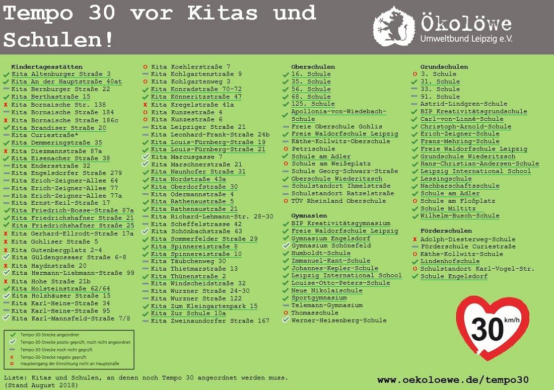 Auf Initiative von uns Ökolöwen und nach einem Antrag der Ratsfraktionen von SPD und Bündnis 90/Die Grünen ist die Umsetzung von Tempo 30 vor allen Schulen, Horten und Kitas seit 2014 auch in Leipzig Beschlusssache. Nach anfänglichen Schwierigkeiten können sich seit 2016 die ersten Kitas und Schulen über ein neues Tempo-30-Schild freuen.