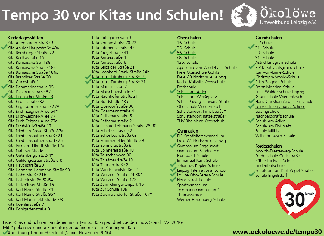 Auf Initiative von uns Ökolöwen und nach einem Antrag der Leipziger Ratsfraktionen von SPD und B90/DIE GRÜNEN ist die Umsetzung von Tempo 30 vor allen Schulen, Horten und Kitas seit 2014 auch in Leipzig Beschlusssache. Nun können sich die ersten Kitas und Schulen über ein Tempo-30-Schild freuen.